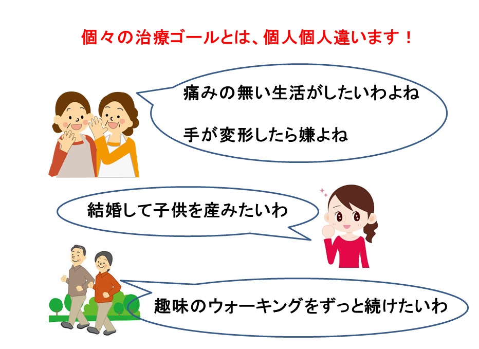 関節リウマチの治療は患者さん個々の生活・社会背景を捉えながら、個々に治療ゴールを設定し治療を進めていきます。ゴールに正しく向かっているかを評価する必要があると考えます。